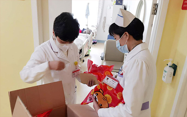 10月1日一大早,在医务科顾主任的带领下,护士长和护士们把这些中秋月饼大礼包和贺卡送到患儿和家属手中。